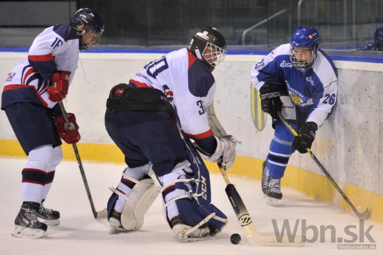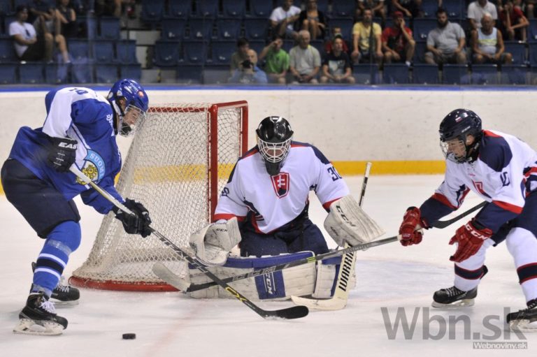 Zľava: Brankár Roman Durný zo Slovenska a Janne Kuokkanen a Kristian Vesalainen z Fínska v zápase B-skupiny turnaja hokejových výberov do 18 rokov Memoriál Ivana Hlinku Slovensko - Fínsko. Bratislava, 11. august 2015. Foto: SITA/Ján Slovák