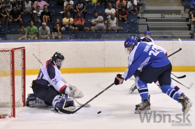 Sprava: Samuel Rudy a brankár Roman Durný zo Slovenska a Kristian Vesalainen z Fínska v zápase B-skupiny turnaja hokejových výberov do 18 rokov Memoriál Ivana Hlinku Slovensko - Fínsko. Bratislava, 11. august 2015. Foto: SITA/Ján Slovák
