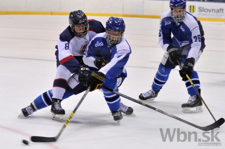 Zľava: Miloš Roman zo Slovenska a Juuso Välimäki a Otto Koivula z Fínska v zápase B-skupiny turnaja hokejových výberov do 18 rokov Memoriál Ivana Hlinku Slovensko - Fínsko. Bratislava, 11. august 2015. Foto: SITA/Ján Slovák