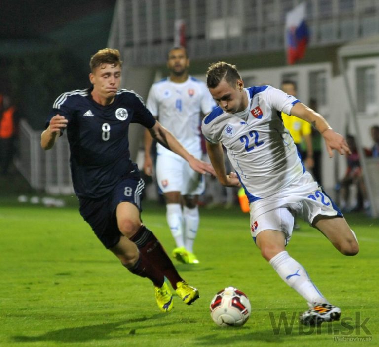 Ondrej Duda (vpravo) zo Slovenska a Lewis Macleod zo Škótska v zápase 3. skupiny kvalifikácie o postup do baráže o účasť na ME 2015 hráčov do 21 rokov Slovensko - Škótsko. Senec, 4. september 2014. Foto: SITA/Ján Slovák