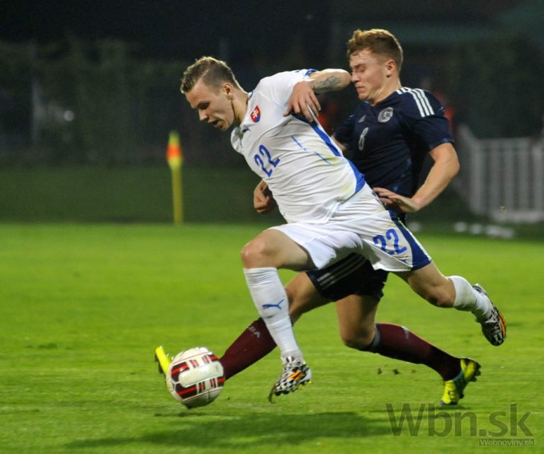 Adam Zreľák (vpravo) zo Slovenska a Stuart Findlay zo Škótska v zápase 3. skupiny kvalifikácie o postup do baráže o účasť na ME 2015 hráčov do 21 rokov medzi Slovensko - Škótsko. Senec, 4. september 2014. Foto: SITA/Ján Slovák