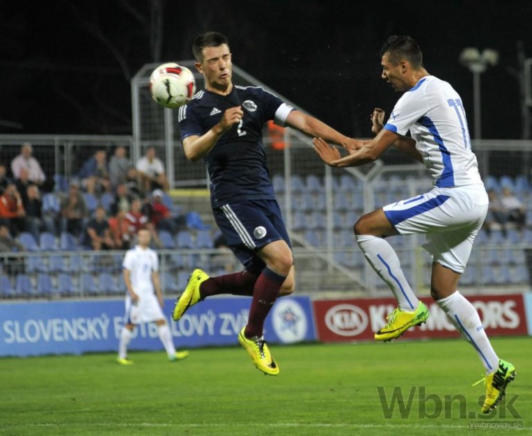 Ivan Schranz (vpravo) zo Slovenska a Jack Ryan zo Škótska v zápase 3. skupiny kvalifikácie o postup do baráže o účasť na ME 2015 hráčov do 21 rokov Slovensko - Škótsko. Senec, 4. september 2014. Foto: SITA/Ján Slovák
