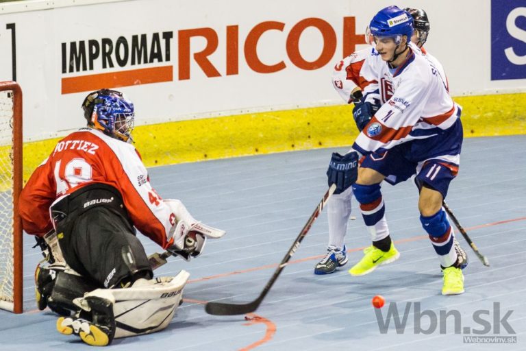Hráč Slovenska Richard Mráz (uprostred) a brankár Švajčiarska Adrien Mottiez (vľavo) počas hokejbalového zápasu medzi Slovensko U20 a Švajčiarsko U20 na Majstrovstvách sveta v hokejbale 2014. Bratislava, 24. jún 2014. Foto: SITA/Jozef Jakubčo