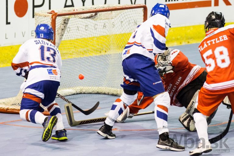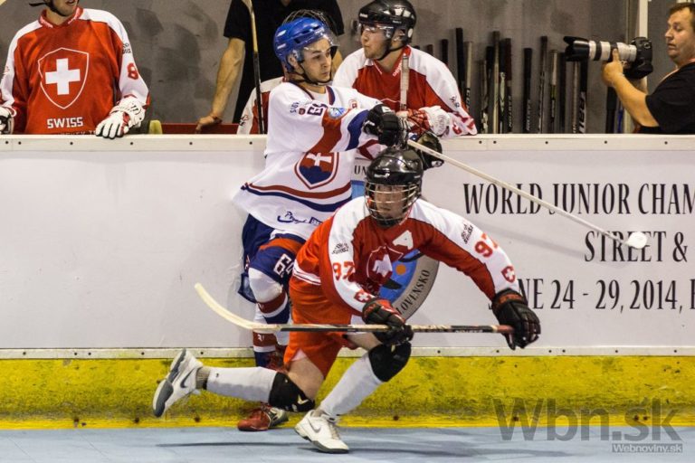 Hráč Slovenska Martin Ďurkovič (vľavo) počas hokejbalového zápasu medzi Slovensko U20 a Švajčiarsko U20 na Majstrovstvách sveta v hokejbale 2014. Bratislava, 24. jún 2014. Foto: SITA/Jozef Jakubčo