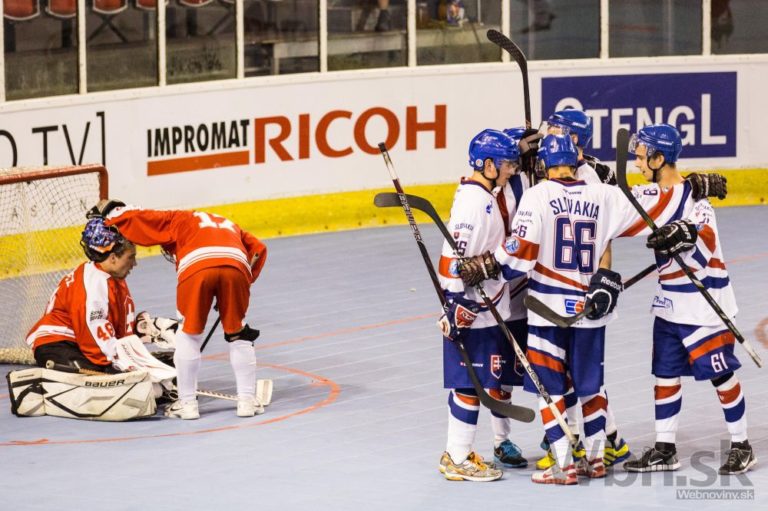 Hráči Slovenska (vpravo) sa tešia zo streleného gólu počas hokejbalového zápasu medzi Slovensko U20 a Švajčiarsko U20 na Majstrovstvách sveta v hokejbale 2014. Bratislava, 24. jún 2014. Foto: SITA/Jozef Jakubčo