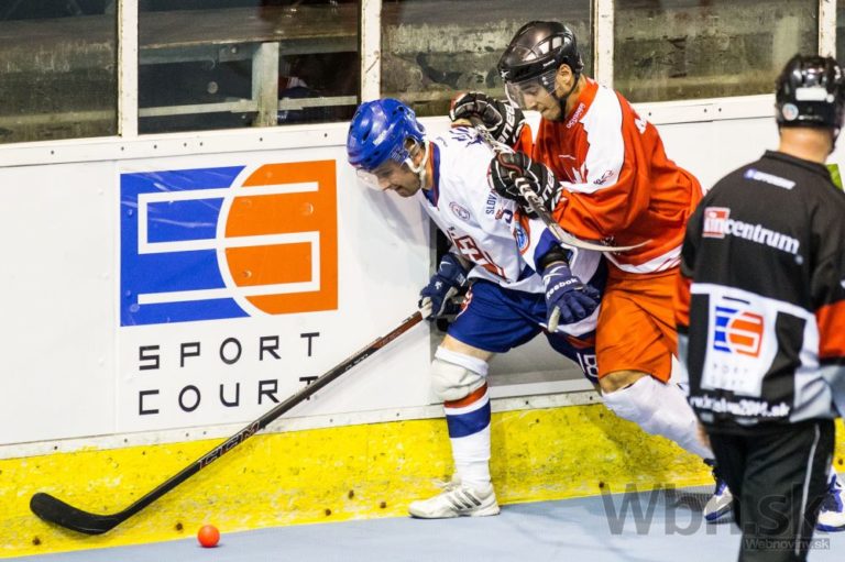Hráč Slovenska Tomáš Hirkala (vľavo) počas hokejbalového zápasu medzi Slovensko U20 a Švajčiarsko U20 na Majstrovstvách sveta v hokejbale 2014. Bratislava, 24. jún 2014. Foto: SITA/Jozef Jakubčo