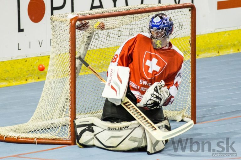 Brankár Švajčiarska Adrien Mottiez počas hokejbalového zápasu medzi Slovensko U20 a Švajčiarsko U20 na Majstrovstvách sveta v hokejbale 2014. Bratislava, 24. jún 2014. Foto: SITA/Jozef Jakubčo