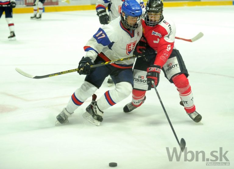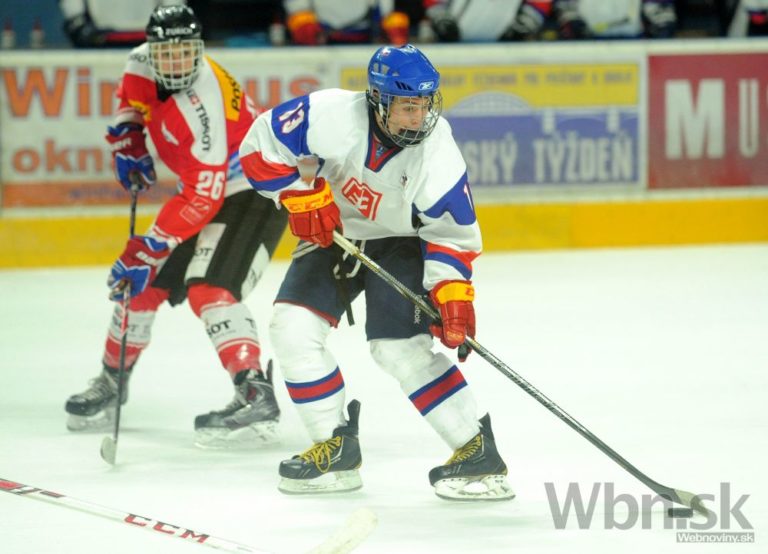 Patrik Kolesár zo Slovenska (vpravo) v hokejovom zápase Memoriál Ivana Hlinku výberov do 18 rokov medzi Slovensko - Švajčiarsko. Piešťany, 12. august 2014. Foto: SITA/Martin Havran