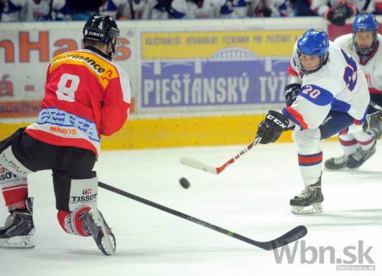Peter Valent zo Slovenska (vpravo) a Yanik Burren zo Švajčiarska (vľavo) v hokejovom zápase Memoriál Ivana Hlinku výberov do 18 rokov medzi Slovensko - Švajčiarsko. Piešťany, 12. august 2014. Foto: SITA/Martin Havran