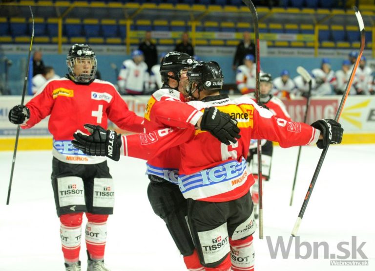 Reprezentanti zo Švajčiarska po úvodnom góle v hokejovom zápase Memoriál Ivana Hlinku výberov do 18 rokov medzi Slovensko - Švajčiarsko. Piešťany, 12. august 2014. Foto: SITA/Martin Havran