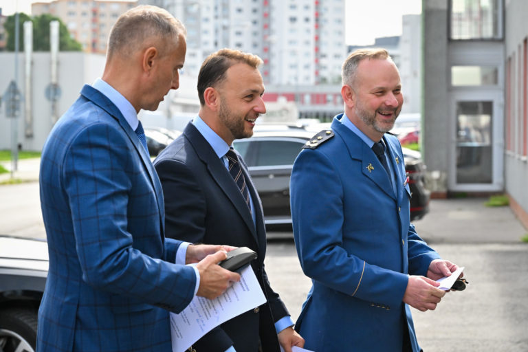 Zľava: Minister investícií, regionálneho rozvoja a informatizácie SR Richard Raši, minister vnútra SR Matúš Šutaj Eštok a prezident Hasičského a záchranného zboru SR (HaZZ) Adrián Mifkovič pred tlačovou konferenciou v priestoroch hasičskej stanice v Petržalke v Bratislave na tému: Posilnenie a modernizácia intervenčných kapacít a infraštruktúry na zvládanie katastrof. Bratislava, 8. apríl 2024. Foto: SITA.