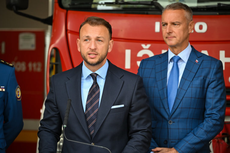 Zľava: Minister vnútra SR Matúš Šutaj Eštok a minister investícií, regionálneho rozvoja a informatizácie SR Richard Raši počas tlačovej konferencie za účasti prezidentaHasičského a záchranného zboru SR (HaZZ) v priestoroch hasičskej stanice v Petržalke v Bratislave na tému: Posilnenie a modernizácia intervenčných kapacít a infraštruktúry na zvládanie katastrof. Bratislava, 8. apríl 2024. Foto: SITA.