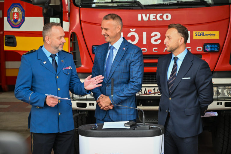 Zľava: Prezident Hasičského a záchranného zboru SR (HaZZ) Adrián Mifkovič, minister investícií, regionálneho rozvoja a informatizácie SR Richard Raši a minister vnútra SR Matúš Šutaj Eštok počas tlačovej konferencie v priestoroch hasičskej stanice v Petržalke v Bratislave na tému: Posilnenie a modernizácia intervenčných kapacít a infraštruktúry na zvládanie katastrof. Bratislava, 8. apríl 2024. Foto: SITA.