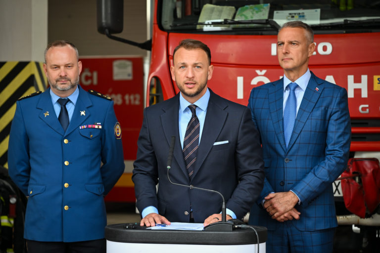 Sprava: Minister vnútra SR Matúš Šutaj Eštok, minister investícií, regionálneho rozvoja a informatizácie SR Richard Raši a prezident Hasičského a záchranného zboru SR (HaZZ) Adrián Mifkovič počas tlačovej konferencie v priestoroch hasičskej stanice v Petržalke v Bratislave na tému: Posilnenie a modernizácia intervenčných kapacít a infraštruktúry na zvládanie katastrof. Bratislava, 8. apríl 2024. Foto: SITA.