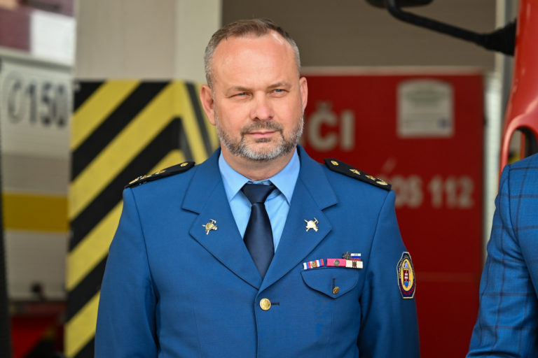 Prezident Hasičského a záchranného zboru SR (HaZZ) Adrián Mifkovič počas tlačovej konferencie za účasti ministra vnútra a ministra invetsícií v priestoroch hasičskej stanice v Petržalke v Bratislave na tému: Posilnenie a modernizácia intervenčných kapacít a infraštruktúry na zvládanie katastrof. Bratislava, 8. apríl 2024. Foto: SITA.