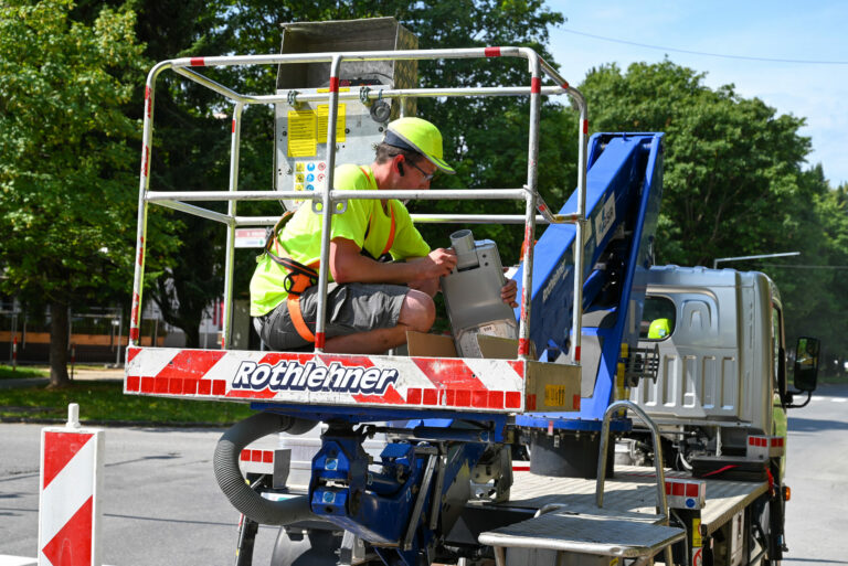 Primátor mesta Martin Ján Danko (vpravo) počas verejného kontrolného dňa k postupu modernizácie verejného osvetlenia v meste Martin v mestskej časti Ľadoveň. Martin, 24. jún 2025. Foto: SITA: Mesto Martin