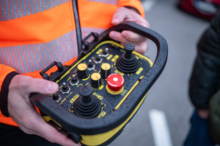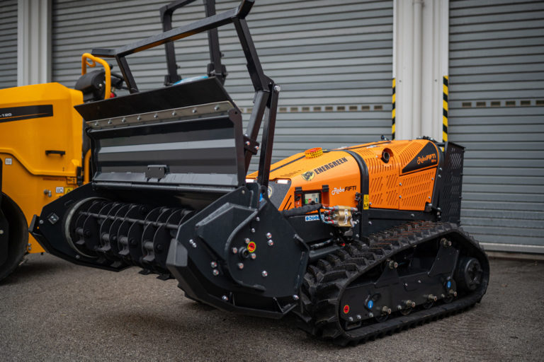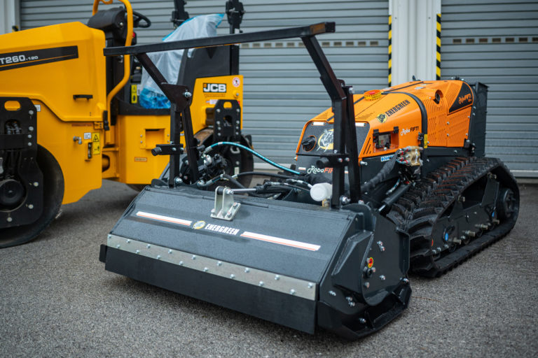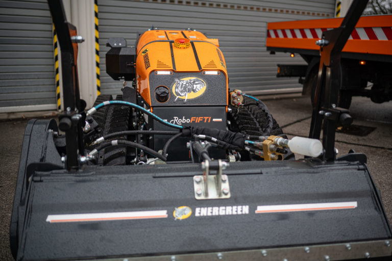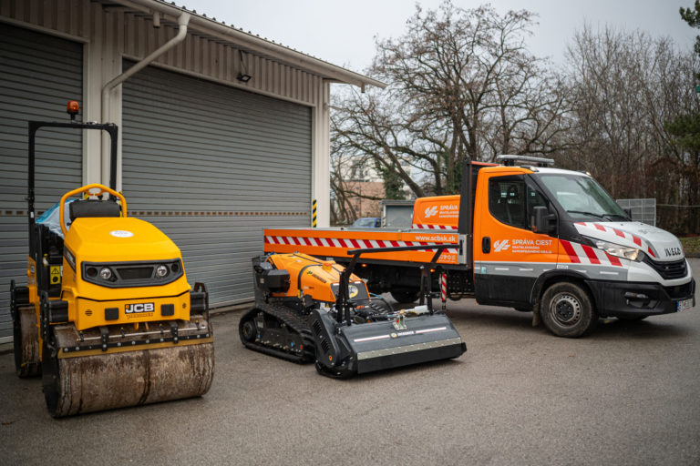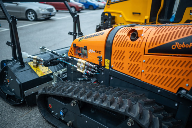 Stroj Robo Energreen na rádiové ovládanie pre lesnícke a pololesnícke práce počas predstavenia nových mechanizmov v Správe ciest Bratislavského samosprávneho kraja (BSK), ktorá má na starosti cesty II. a III. triedy. Bratislava, 5. január 2024. Foto: SITA/BSK