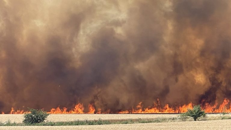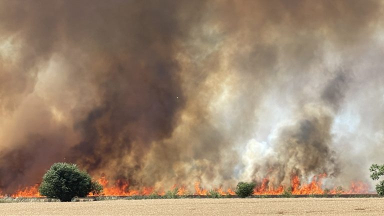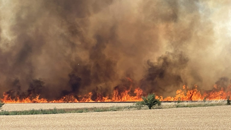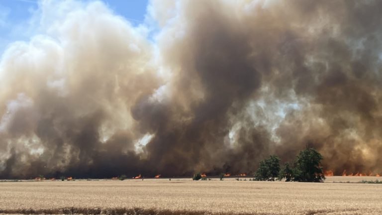 Pohľad na horiace pole od príjazdovej cesty na letisko. Bratislava, 15 júl 2023. Foto: SITA/Milan Illík.