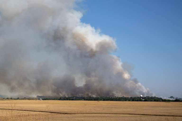 Pohľad na horiace pole za pristávacou dráhou letiska. Bratislava, 15 júl 2023. Foto: SITA/Milan Illík.