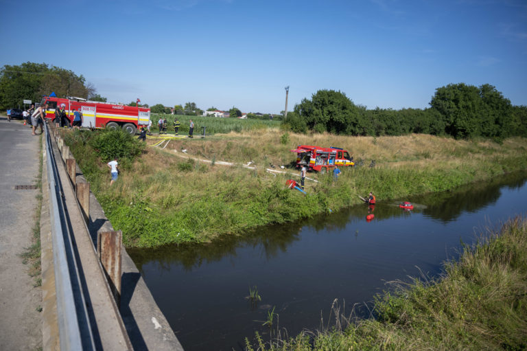 Hasiči čerpajú vodu z Malého Dunaja na hasenie požiaru v bratislavskej v mestskej časti Vrakuňa pri Letisku M. R. Štefánika kde vypukol na poli mohutný požiar. Bratislava, 15. júl 2023. Foto: SITA/Milan Illík.