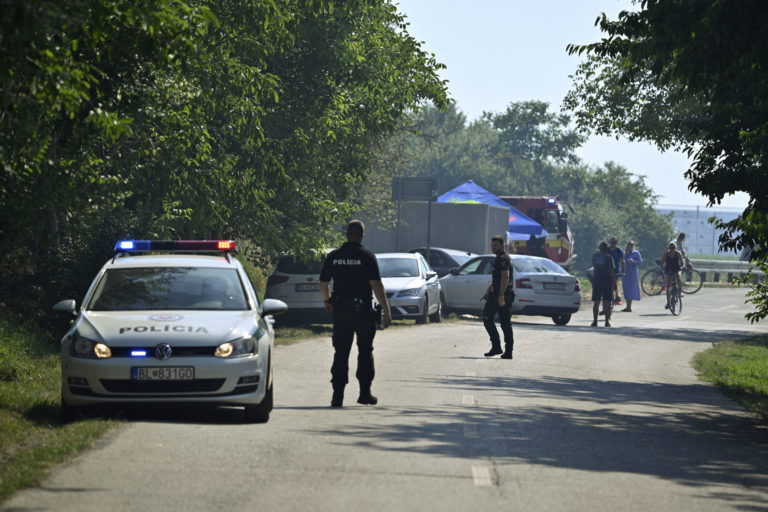 Polícia uzavrela cestu v bratislavskej v mestskej časti Vrakuňa pri Letisku M. R. Štefánika kde vypukol na poli mohutný požiar. Bratislava, 15. júl 2023. Foto: SITA/Milan Illík.