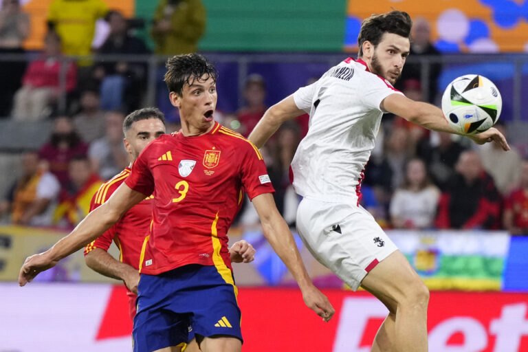 Španielsky hráč Robin Le Normand (vľavo) sa mračí, keď si poslal loptu do vlastnej siete počas zápasu šestnásťfinále proti Gruzínsku na Eure 2024 v nemeckom Kolíne nad Rýnom v nedeľu 30. júna 2024. Foto: SITA/AP Photo/Manu Fernandez