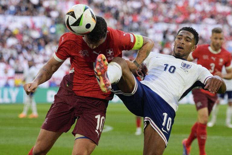 Angličan Jude Bellingham (vpravo) a Švajčiar Granit Xhaka bojujú o loptu počas štvrťfinálového zápasu na Eure 2024 v nemeckom Düsseldorfe v sobotu 6. júla 2024. Foto: SITA/(AP Photo/Martin Meissner
