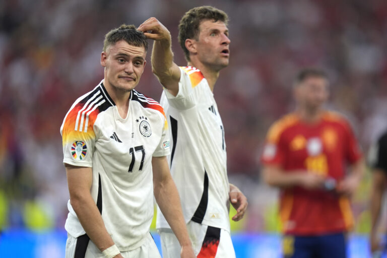Nemec Florian Wirtz (vľavo) a Nemec Thomas Müller reagujú po konci štvrťfinálového zápasu proti Španielsku na Eure 2024 v Stuttgarte v piatok 5. júla 2024. Foto: SITA/AP Photo/Matthias Schrader