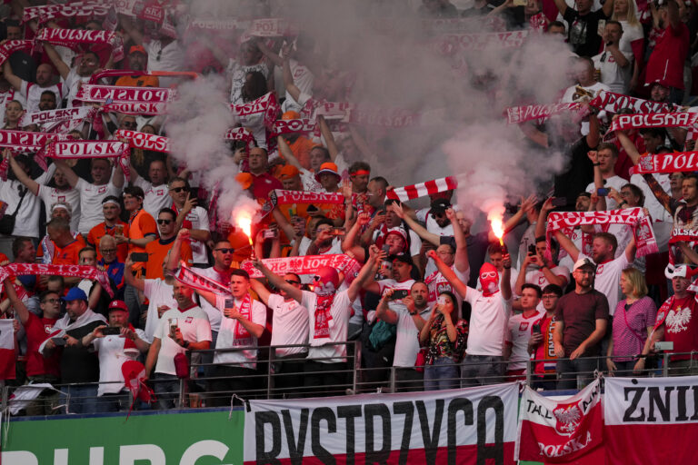 Poľskí fanúšikovia zapaľujú svetlice a povzbudzujú na tribúne počas zápasu skupiny D proti Holandsku na Eure 2024 v nemeckom Hamburgu v nedeľu 16. júna 2024. Foto: SITA/AP Photo/Sunday Alamba