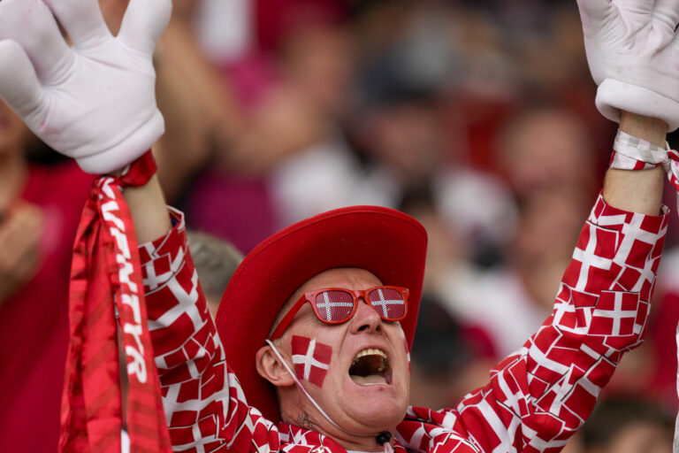 Dánsky fanúšik povzbudzuje svoj tím pred zápasom skupiny C proti Slovinsku na Eure 2024 v nemeckom Stuttgarte v nedeľu 16. júna 2024. Foto: SITA/AP Photo/Antonio Calanni