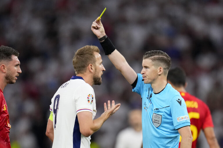 Rozhodca Francois Letexier ukazuje žltú kartu anglickému hráčovi Harrymu Kaneovi (uprostred) počas finálového zápasu medzi Španielskom a Anglickom na Eure 2024 v Berlíne v nedeľu 14. júla 2024. Foto: SITA/AP Photo/Manu Fernandez