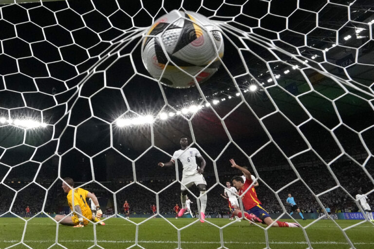 Španielsky hráč Mikel Oyarzabal (vpravo vpredu) strieľa druhý gól svojho tímu počas finálového zápasu proti Anglicku na Eure 2024 v Berlíne v nedeľu 14. júla 2024. Foto: SITA/AP Photo/Matthias Schrader