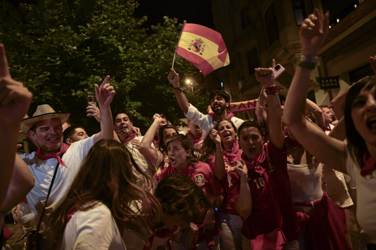 Ľudia oslavujú po víťazstve španielskeho futbalového družstva na Eure 2024 proti Anglicku v Berlíne na festivale San Fermin v Pamplone na severe Španielska v nedeľu 14. júla 2024. Foto: SITA/(AP Photo/Alvaro Barrientos