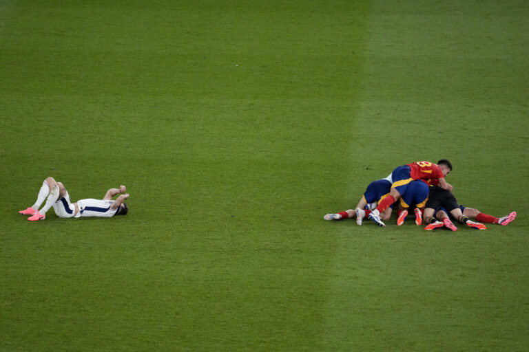Hráči Španielska oslavujú po tom, ako ich tím zdolal Anglicko 2:1 vo finálovom zápase na Eure 2024 v Berlíne v nedeľu 14. júla 2024. Foto: SITA/AP Photo/Thanassis Stavrakis