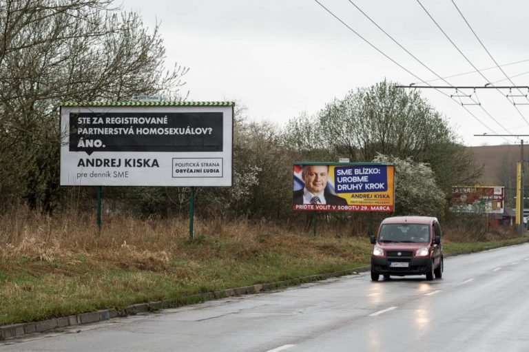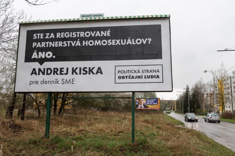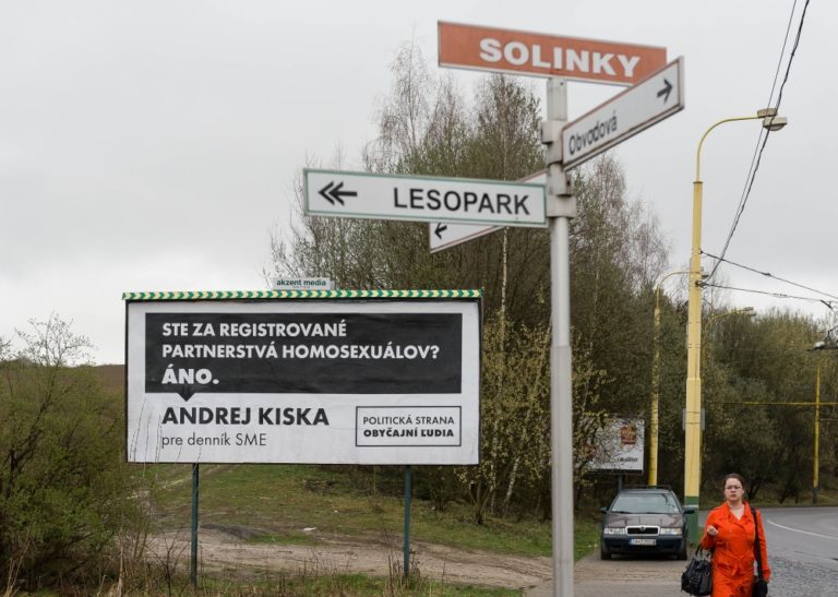 Bilbord politickej strany Obyčajní ľudia pri obchodnom centre v Žiline. Žilina, 24. marec 2014. Foto: SITA/Milo Fabian