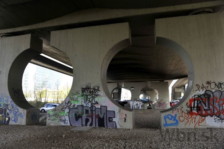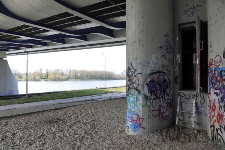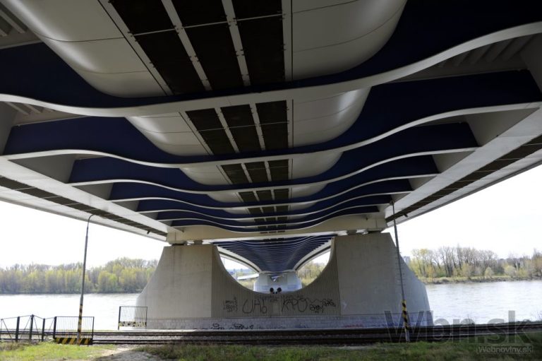 Pohľad na spodnú časť Mosta Apollo počas novinárskej exkurzie pri príležitosti 10-výročia mosta. Bratislava, 15. apríl 2015. Foto: SITA/Ján Slovák