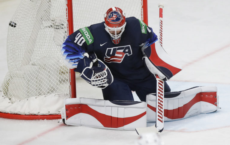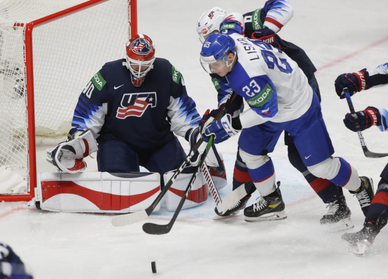 Zákrok amerického brankára Cala Petersena po teči slovenského útočníka Róberta Lantošiho počas štvrťfinálového zápasu na MS v hokeji 2021. Riga, 3. jún 2021. Foto: SITA/AP.