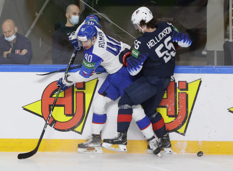Američan Matt Hellickson v súboji so slovenským útočníkom Milošom Romanom počas zápasu na MS v hokeji 2021. Riga, 3. jún 2021. Foto: SITA/AP.