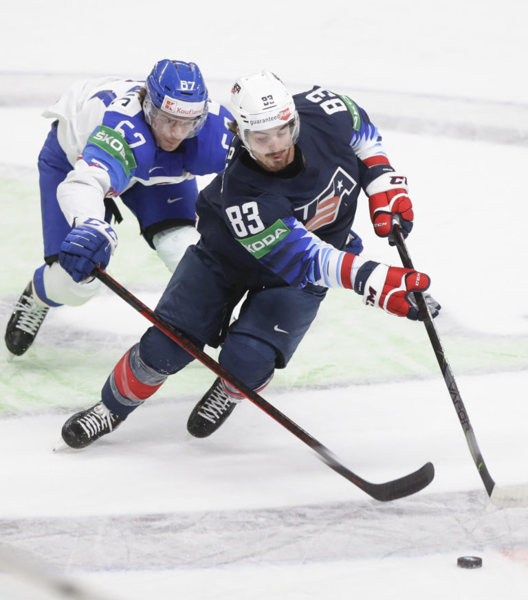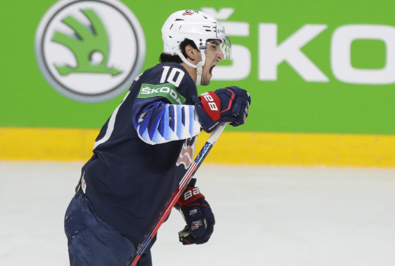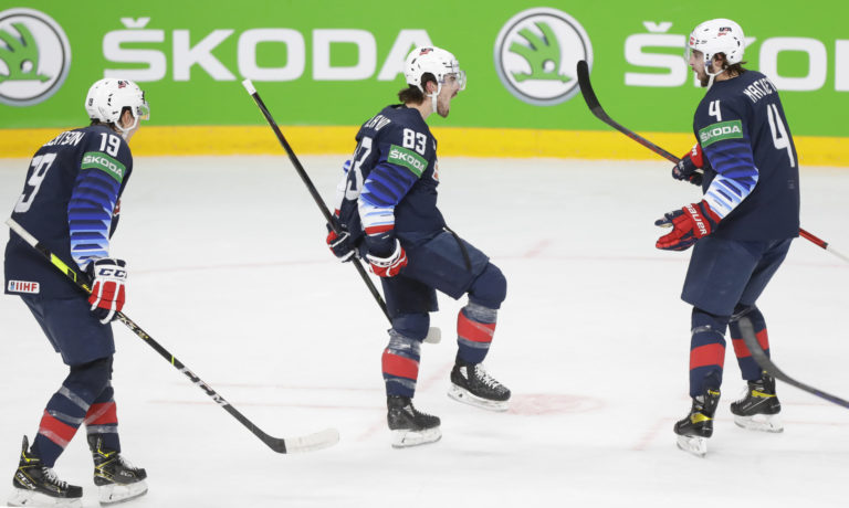 Americký útočník Conor Garland sa teší z gólu v sieti Slovenska počas štvrťfinálového zápasu na MS v hokeji 2021. Riga, 3. jún 2021 Foto: SITA/AP.