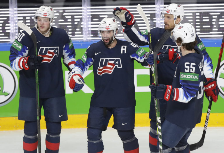 Radosť amerických hokejistov po góle Colina Blackwella v sieti Slovenska počas štvrťfinálového zápasu na MS v hokeji 2021. Riga, 3. jún 2021. Foto: SITA/AP.