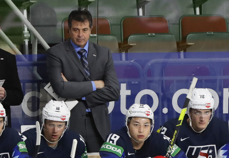 Tréner americkej reprezentácie Jack Capuano počas štvrťfinálového zápasu proti Slovensku na MS v hokeji 2021. Riga, 3. jún 2021. Foto: SITA/AP.