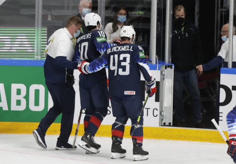 Zranený americký útočník Matty Beniers počas štvrťfinálového zápasu proti Slovensku na MS v hokeji 2021. Riga, 3 jún 2021. Foto: SITA/AP.