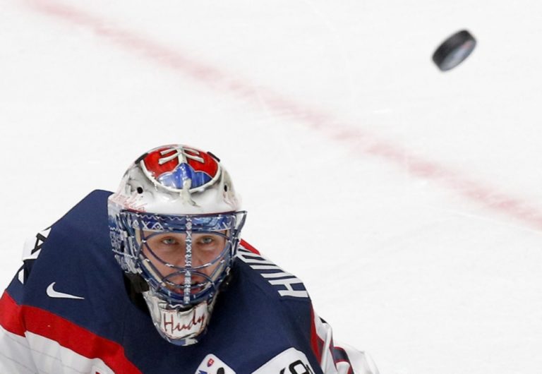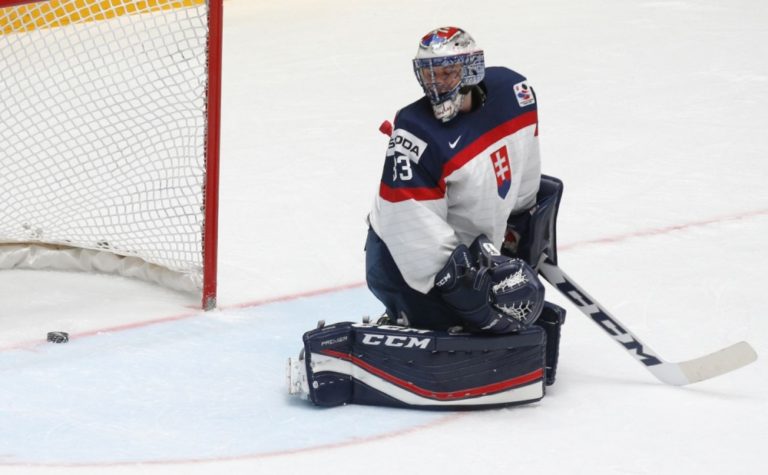 Zákrok bieloruského brankára Vitalija Kovaľa počas zápasu proti Slovensku na svetovom šampionáte v Rusku. Petrohrad, 11. máj 2016. Foto: SITA/AP