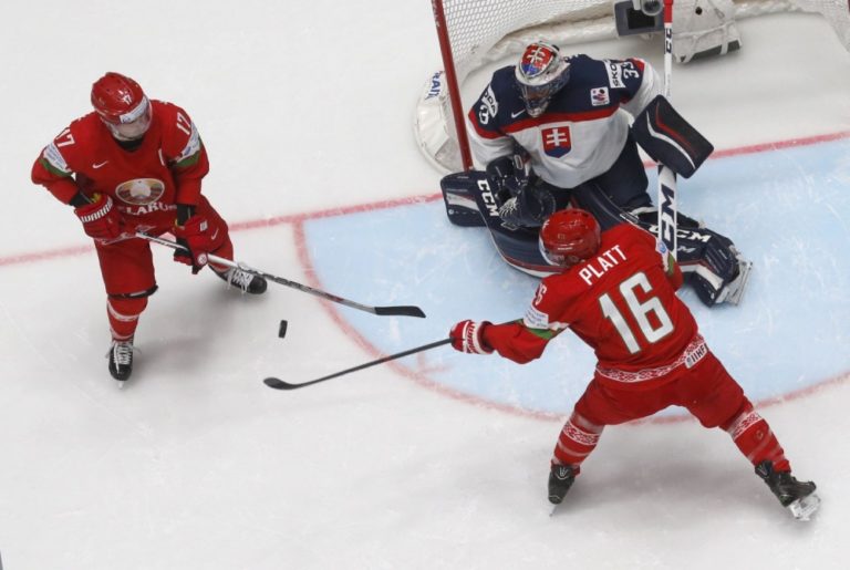 Bieloruskí útočníci Geoff Platt a Alexej Kalužnij sa snažia prekonať slovenského gólmana Júliusa Hudáčka počas zápasu na svetovom šampionáte v Rusku. Petrohrad, 11. máj 2016. Foto: SITA/AP