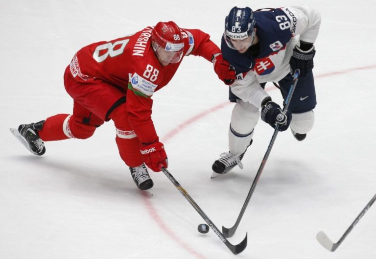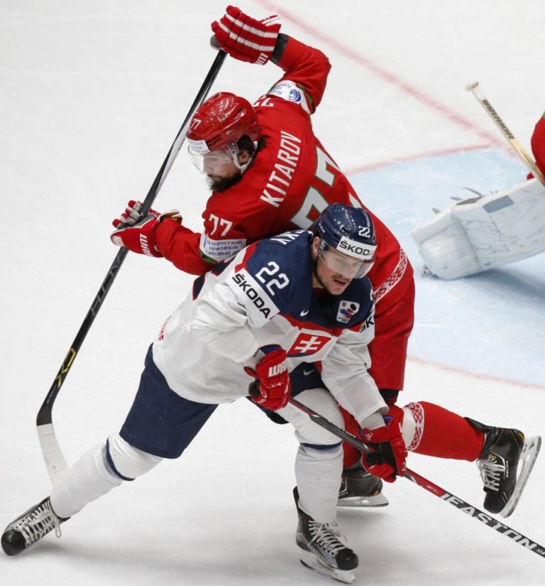 Slovenský útočník Marek Viedenský v súboji s bieloruským obrancom Olegom Jevenkom počas zápasu na svetovom šampionáte v Rusku. Petrohrad, 11. máj 2016. Foto: SITA/AP