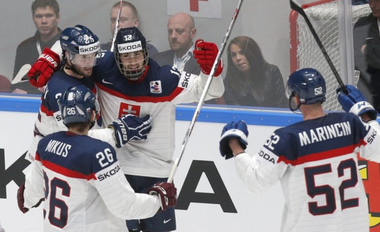 Radosť slovenských hokejistov po góle v sieti Bieloruska počas zápasu na svetovom šampionáte v Rusku. Petrohrad, 11. máj 2016. Foto: SITA/AP