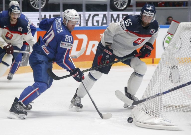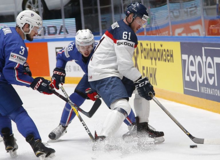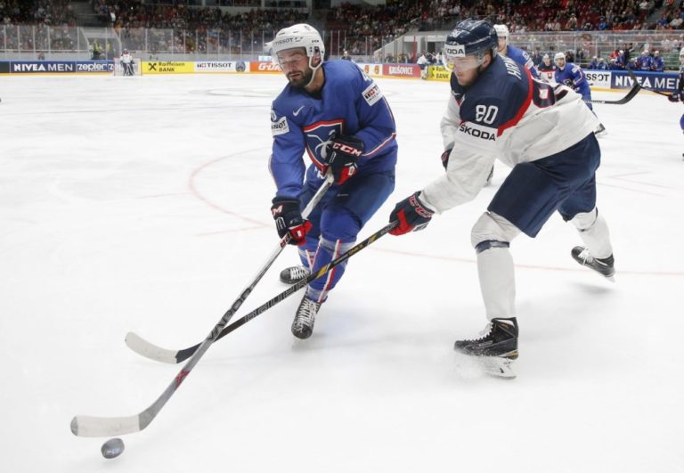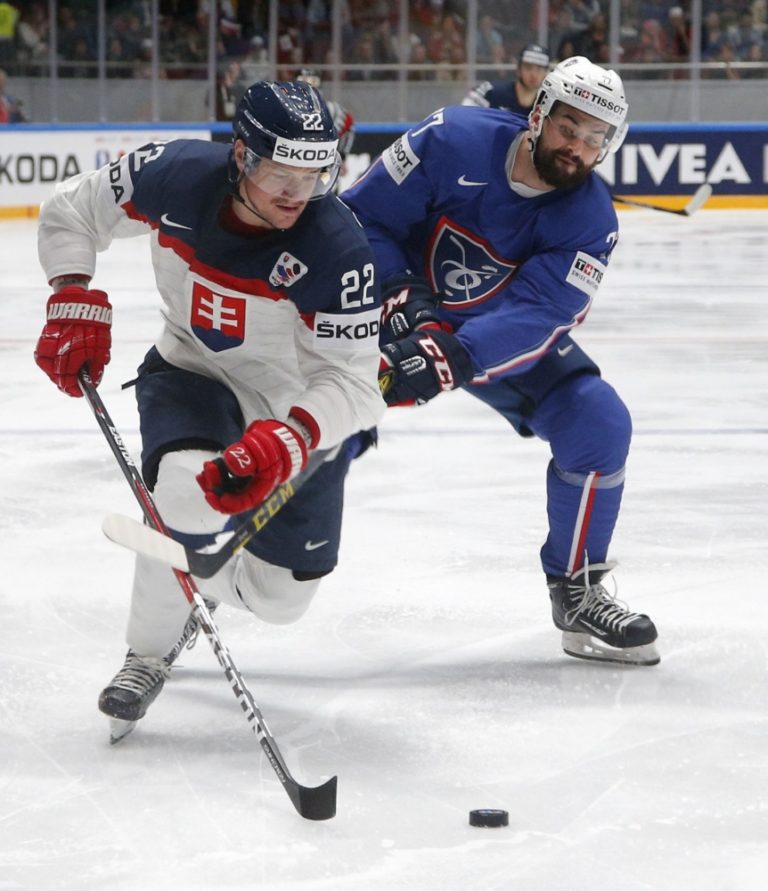 Slovenský útočník Marek Viedenský v súboji s Francúzmi počas zápasu na svetovom šampionáte. Petrohrad, 8. máj 2016. Foto: SITA/AP