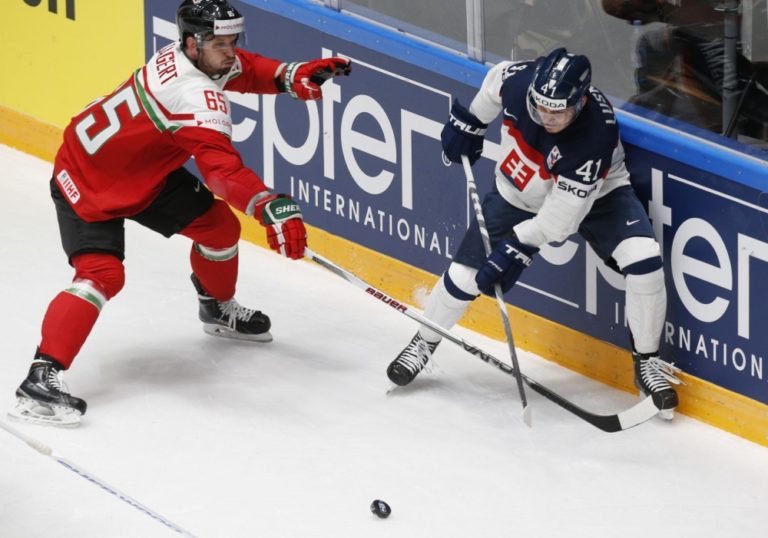 Maďarský útočník Andrew Sarauer v súboji so slovenským útočníkom Tomášom Hrnkom počas zápasu na svetovom šampionáte. Petrohrad, 7. máj 2016. Foto: SITA/AP
