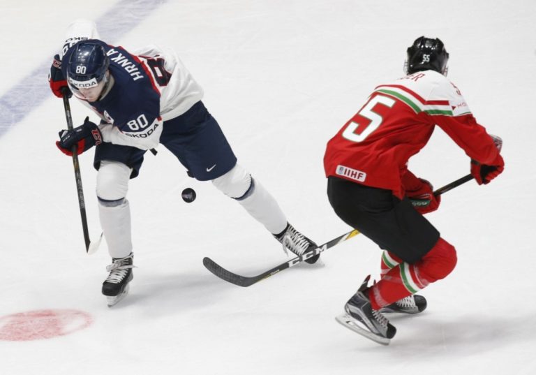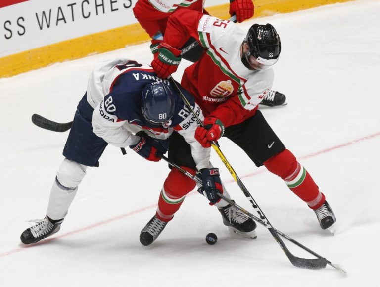 Maďarský obranca Bence Szirányi v súboji so slovenským útočníkom Tomášom Hrnkom počas zápasu na svetovom šampionáte. Petrohrad, 7. máj 2016. Foto: SITA/AP