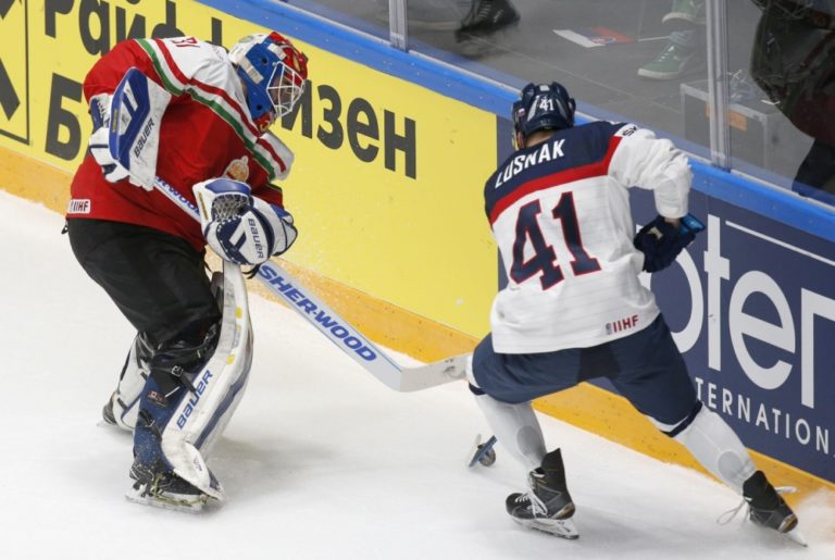 Maďarský brankár Miklos Rajna a slovenský útočník Patrik Lušňák počas zápasu na svetovom šampionáte. Petrohrad, 7. máj 2016. Foto: SITA/AP